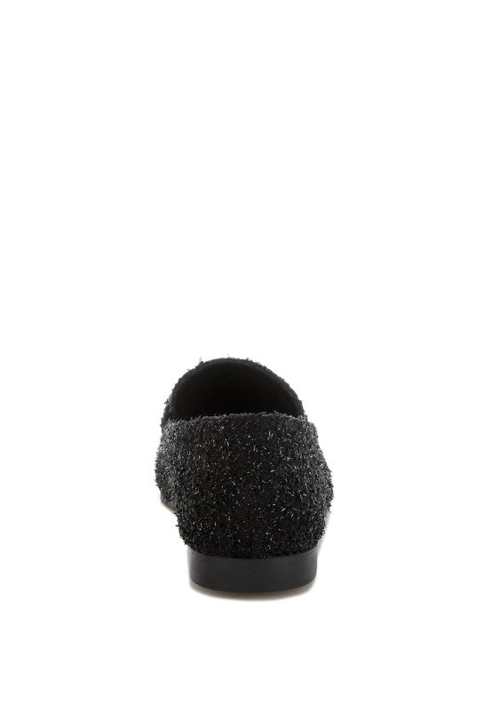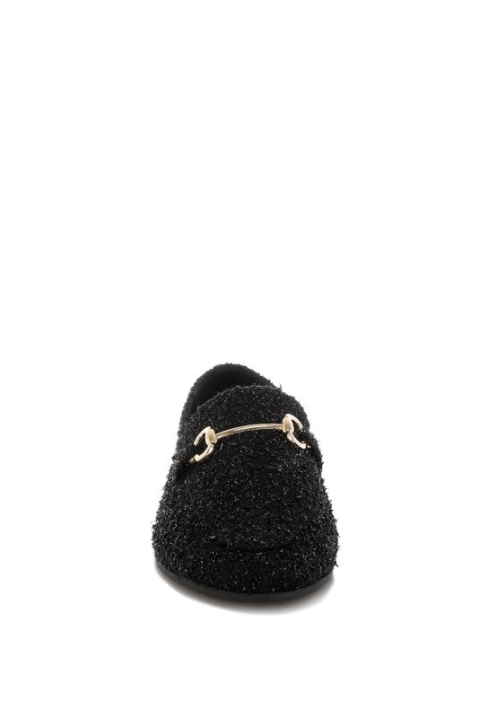 Dazzle all the way with these loafers in woven tweed with interlaced shiny yarns, offering a subtle shimmer and structured durability. The horsebit embellishment enhances the elegance. The comfortable cushioned insole and the flat heel make them a practical choice. Style these loafers with a tailored co-ord set for a bold statement.