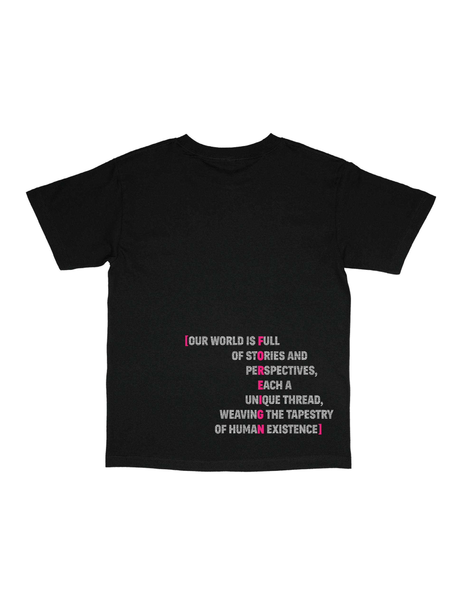 The FO[REIGN] The Tapestry Tee is a tribute to the collective stories and diverse perspectives that shape our shared human history. As part of the FO[REIGN] sub-brand, this tee embodies the idea that "Everything is FO[REIGN] until it's [FAM]ILAR," reflecting the interconnectedness of all cultures and experiences. The design honors the rich tapestry of human existence, reminding us that every story—whether told or untold—adds to the fabric of who we are as a global community.