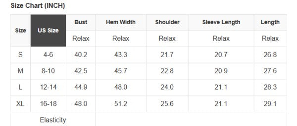 See size chart for approximate measurements.