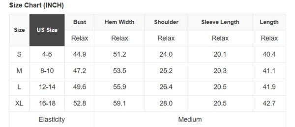 See size chart for approximate measurements.