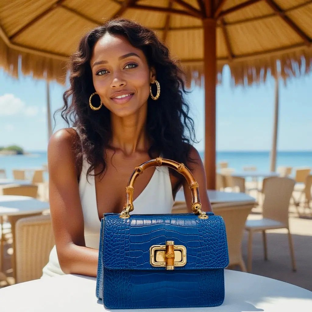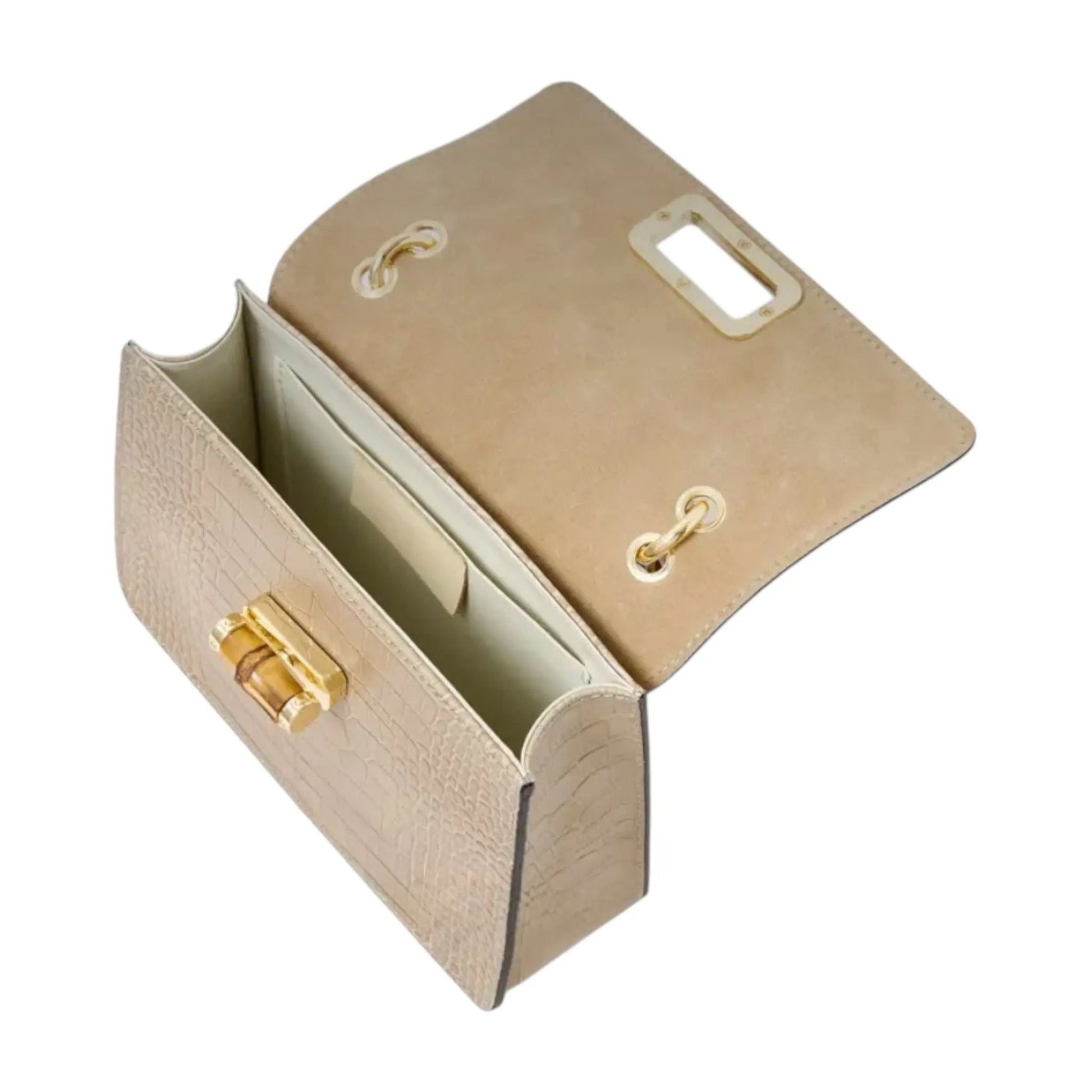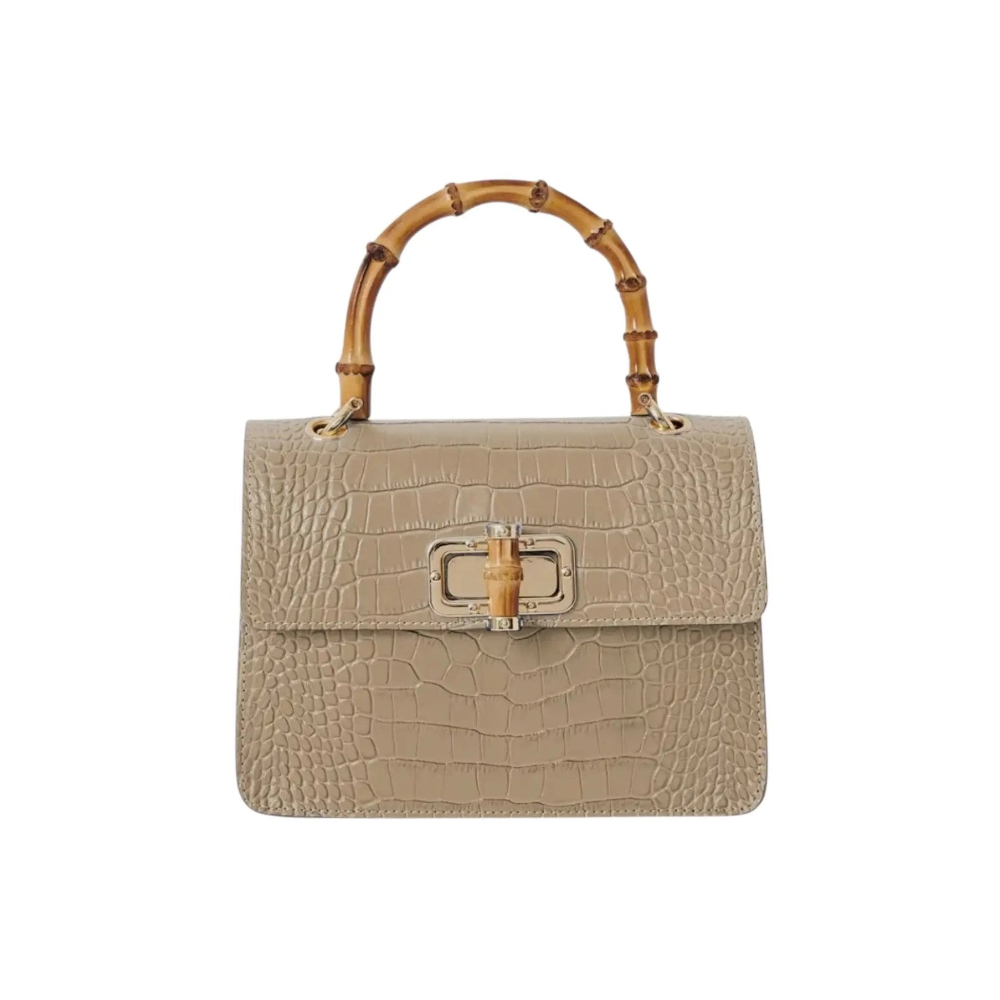 THE MINI HARRIET is the perfect mix of sophisticated and retro. Made from croc embossed Italian leather, this handbag features a genuine bamboo top handle and is embellished with a metal and bamboo interlocking closure. The perfect size for day or night, this bag makes sure you stand out from the crowd.
