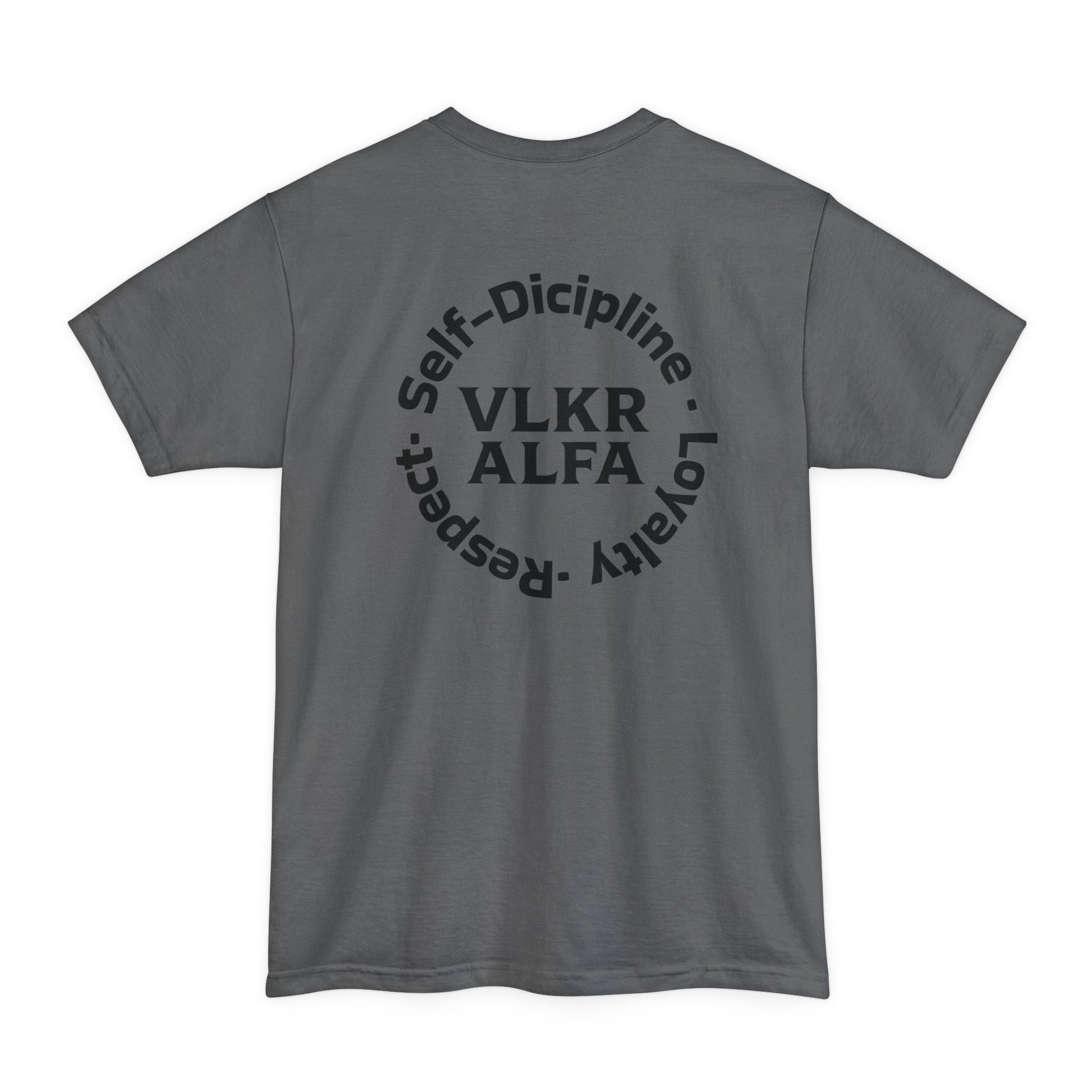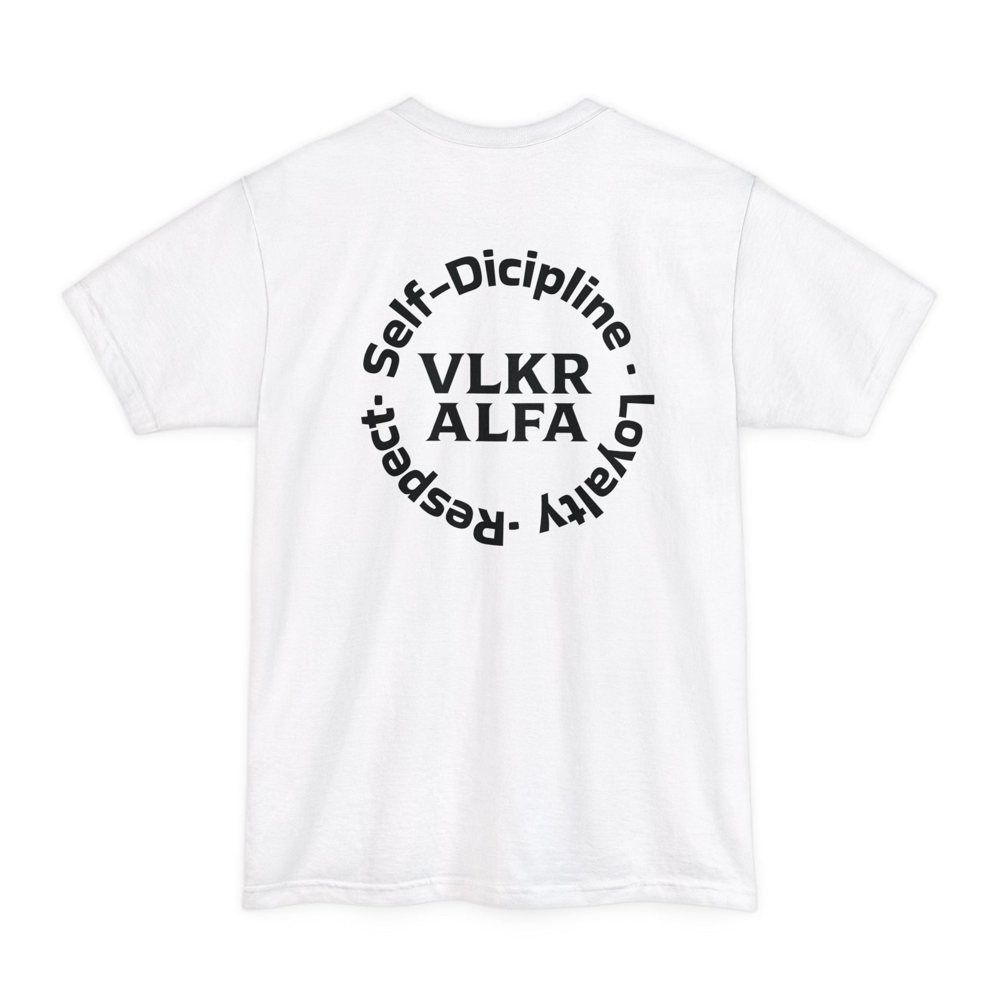 The VLKR ALFA Code Tee features minimalist front branding and a bold back print declaring the core principles of the alpha mindset: Self-Discipline · Loyalty · Respect.